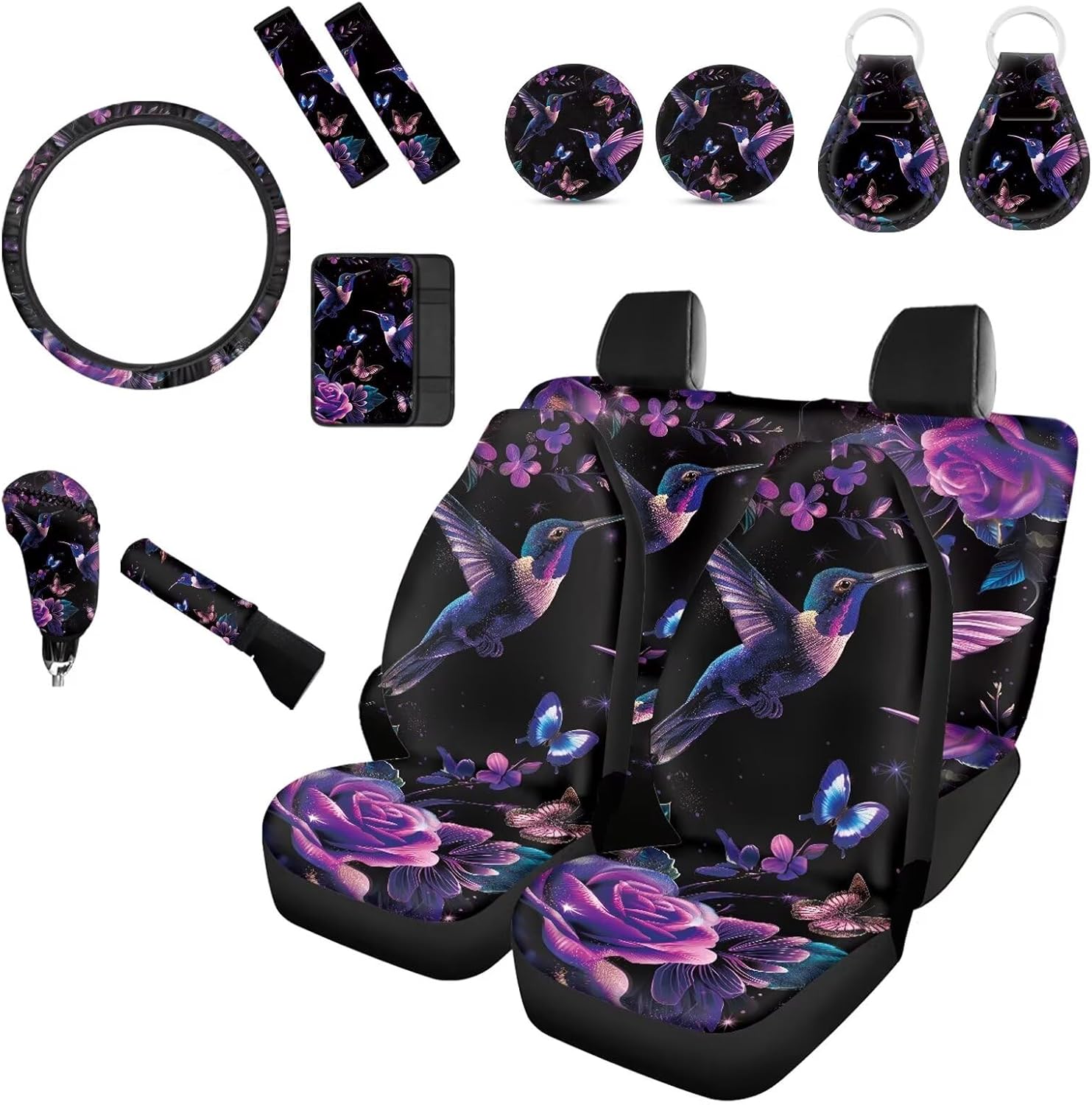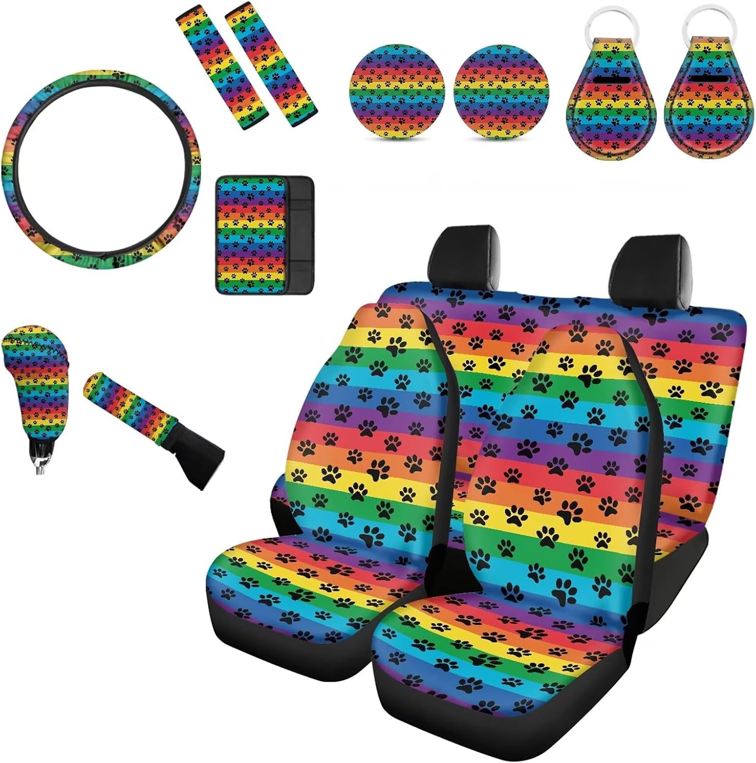 [14 pieces car interior accessories] 4 Seat Cover for Front Rear,2 Seat Belt Cover,1 Steering Wheel Cover,1 Armrest Cushion,1 Handbrake Cover,1Gear Shift Cover,2Car Coaster,2 keychain. [Notes] These car seat cover are not compatible with seats that have integrated airbags. East to install and care,could install with no tool need.washable! If you are not sure car seat covers is suitable for your car seat,please measure your seat size before order to ensure it is fit. Universal fit for most cars suvs trucks vans